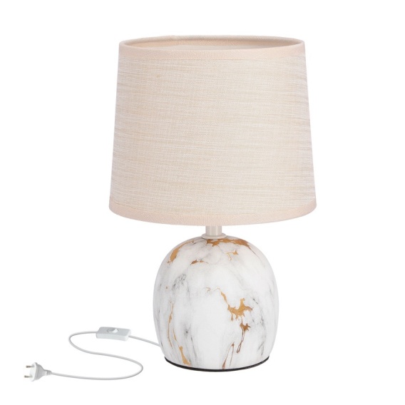 Lampa stołowa ADELINA to stylowe oświetlenie. Wyróżnia się połączeniem solidnej ceramicznej podstawy (dekor: marmuru i subtelnego złota), z beżowym tkaninowym abażurem. Te elementy tworzą harmonijną kompozycję, która doskonale wpisuje się zarówno w nowoczesne, jak i klasyczne aranżacje.